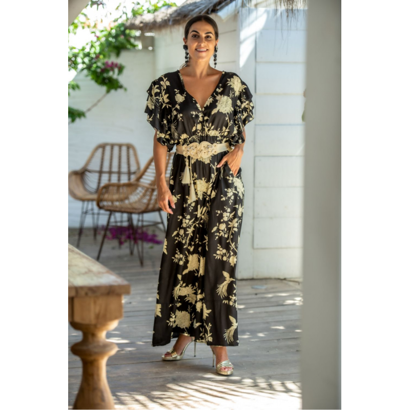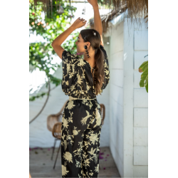 Mono kavala de viscosa negro con flores de mantón beige sin mangas con doble volante en el hombro, cintura fruncida escote cruzado delante y en la espalda.
